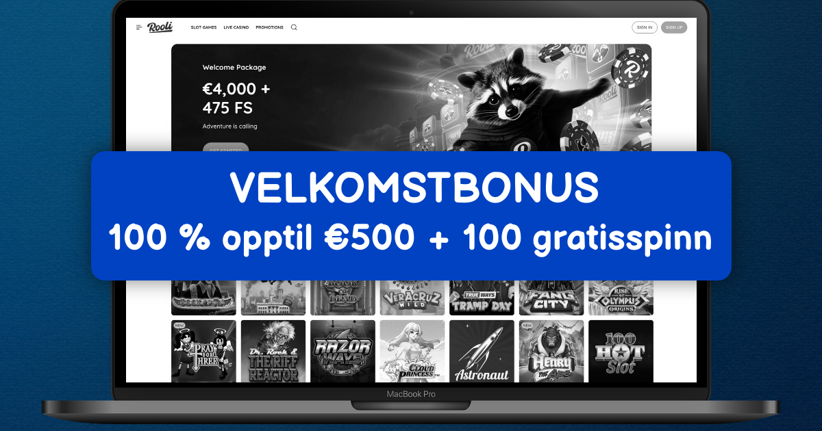 Rooli Casino tilbyr en velkomstpakke for nye kontoer på nettsiden. Pakken kan omfatte 400% opptil $10 000 og opptil 300 gratisspinn, eller 50% opptil $1000 pluss 75 gratisspinn på utvalgte spill. Spillere i Norge aktiverer tilbudet etter registrering og første innskudd på det offisielle kasinoet.